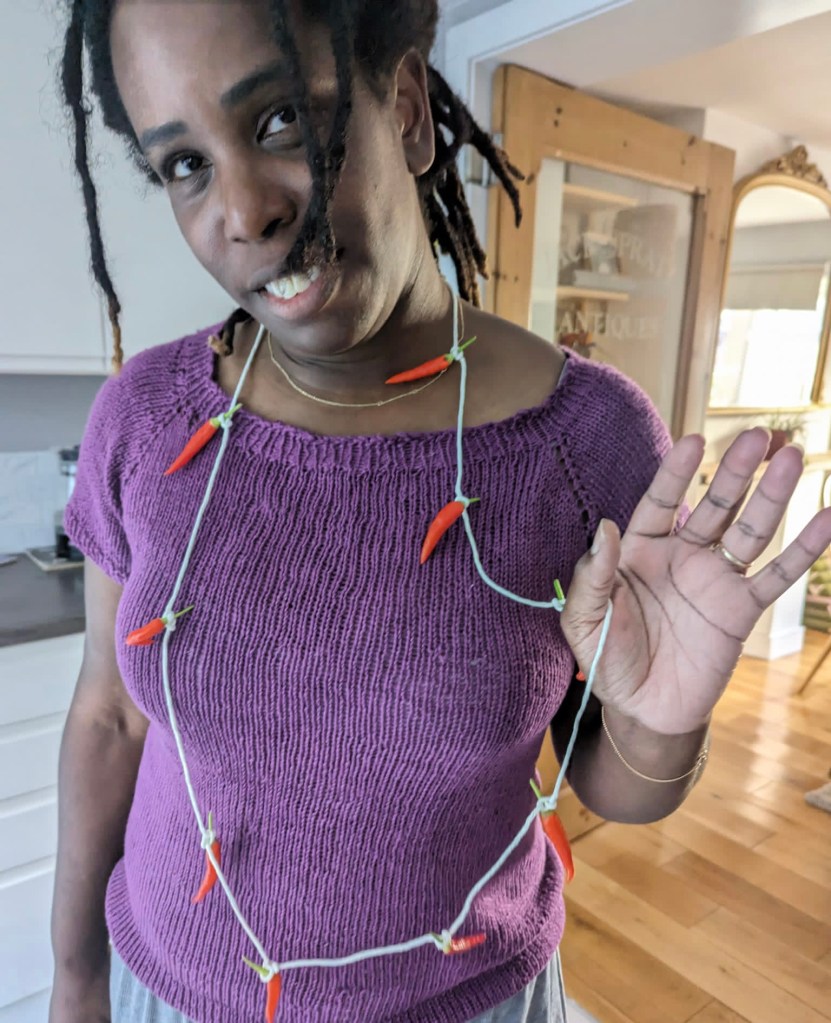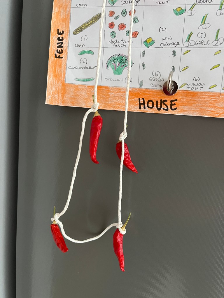I made a garland for some of the chillies to air dry. The rest of them will be spread out on my drying rack for a few weeks.