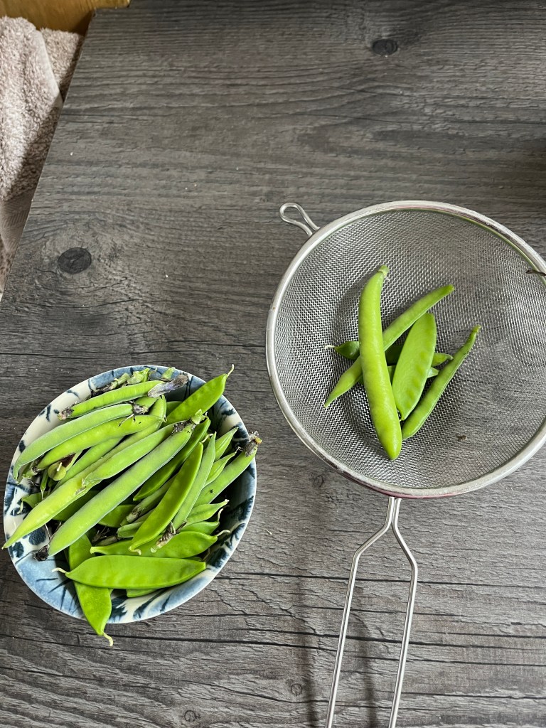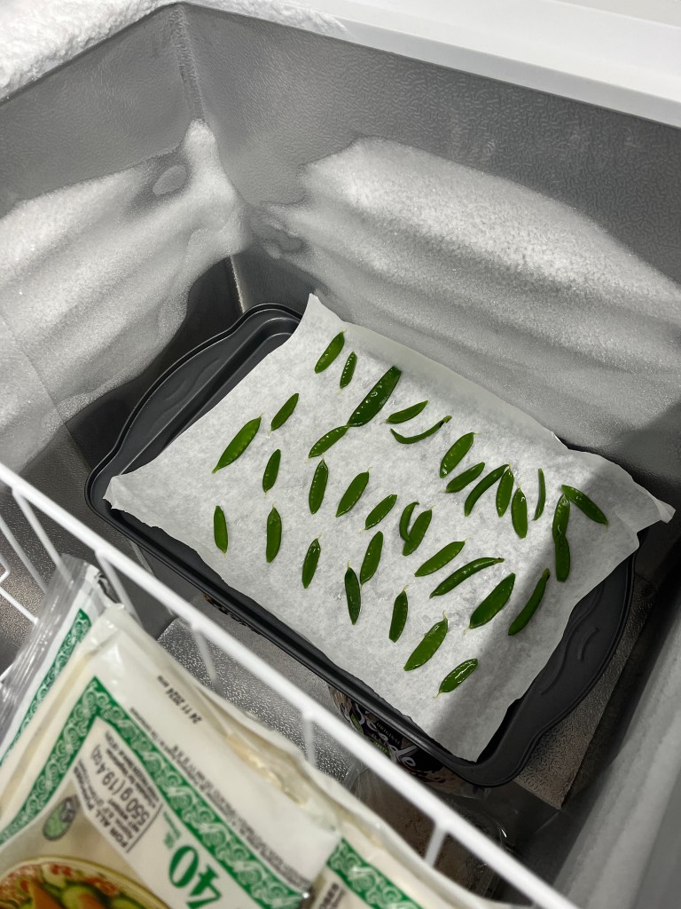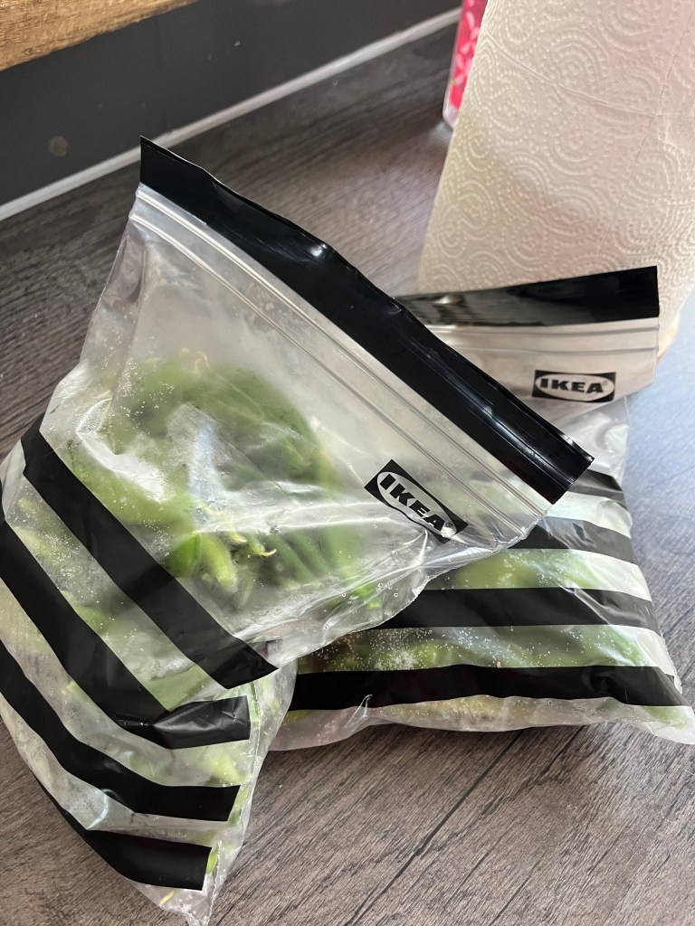 I try to blanche them on the day of harvest. I blanche on a rolling boil for a couple of minutes, dunk in ice water to stop the cooking process. Then I lay the beans out on greaseproof paper on a tray which I then pop into the freezer for an hour or so, so that they don’t freeze in clumps, then I bag them up for the freezer for longer-term storage.