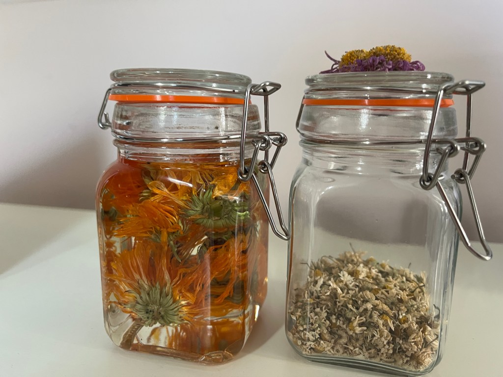 This year, I incorporated the flower in my vegetable beds, cut and dried some hung upside down on my fridge. Once dried, I submerged in sweet almond oil for some weeks, strained and the oil is ready to be used topically.
